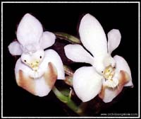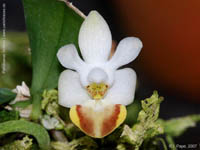 Diese Art besitzt von allen vier Arten die größten Infloreszenzen. Diese werden bis zu 15 cm lang und tragen mehrere Blüten (bis zu 10). Ihre Blätter entsprechen in ihrer Größe den anderen Arten. Sie sind länglich-oval bis elliptisch, ca. 12 cm lang, 4.5 cm breit und einfarbig grün. Die Blüten sind cremeweiss und nur 15 mm im Durchmesser . Die dreigeteilte Lippe besitzt auf dem Mittellappen zwei auffällige gelbe Flächen. Die Seitenlappen sind nach oben gebogen und besitzen gelblich braune Flecken. Die Säule weist einige Flecken in selber Färbung auf.
